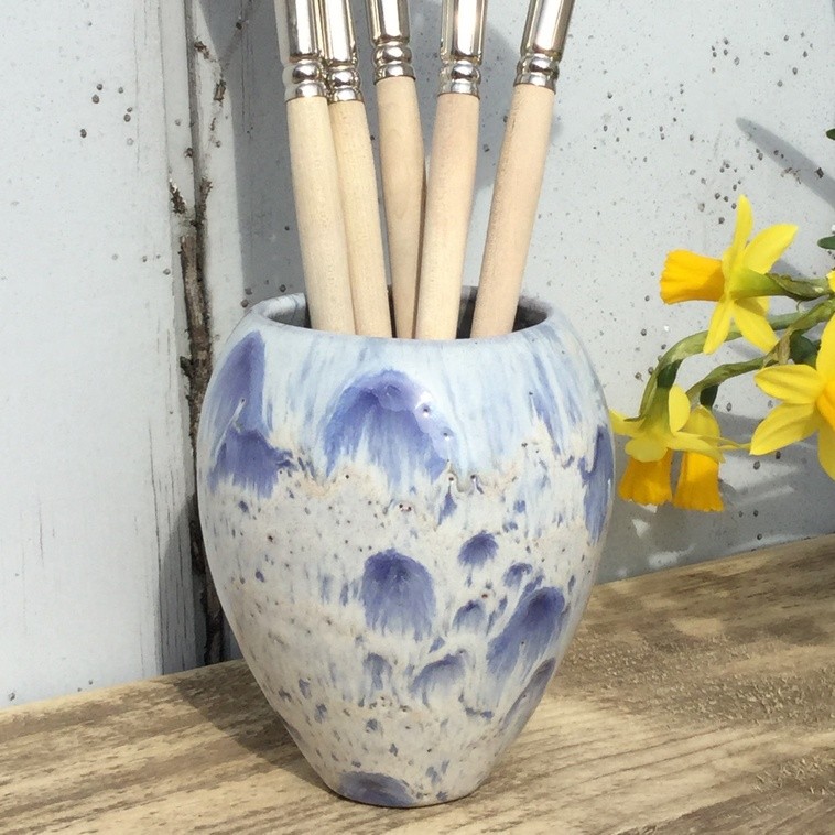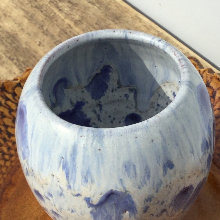 - Macchie di flusso blu intenso che formano motivi floreali su un colore champagne