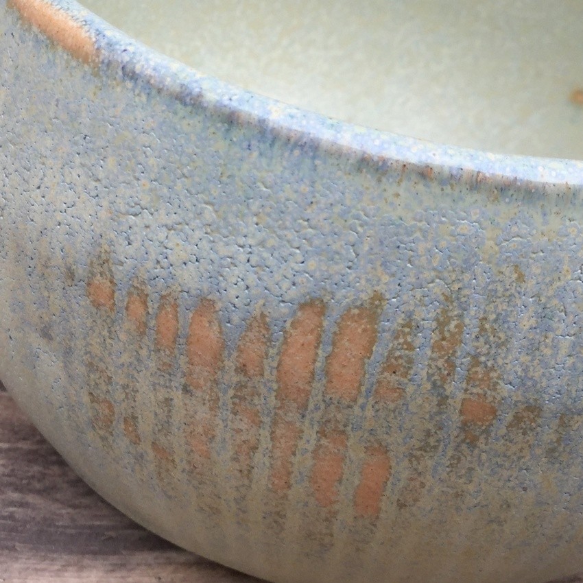 - Ad una temp. di 1250°C abbiamo: smalto satinato con un bellissimo gioco di colori prevalentemente ocra con precipitazioni color crema e blu, se applicato con uno strato sottile si avrà un colore terracotta-arancio